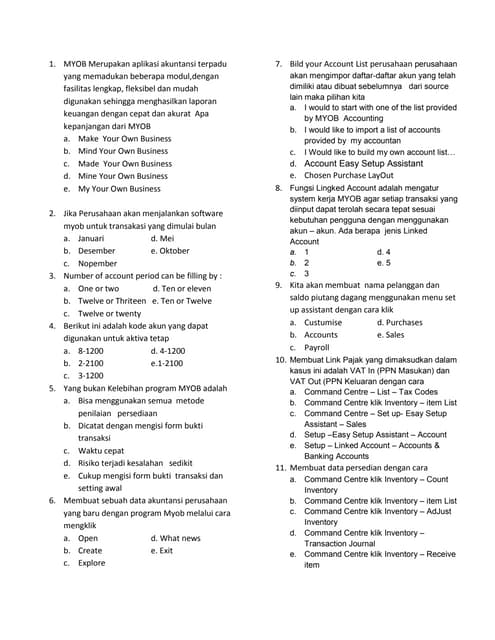 Doc Soal Soal Pilihan Ganda Myob Beserta Jawabannya Fina Dwinuriyani Academia Edu from 0.academia-photos.com Pr lks intan pariwara kelas 12 (xii) semester 1 dan 2 tahun 2019/2020 pdf klik disini. Pada proses import daftar akun dalam myob accounting, pada kolom. Contoh soal dan jawaban ulangan hadits ilmu hadits materi ilmu pengetahuan dan teknologi kelas 12 aliyah k13. Mata pelajaran sejarah merupakan salah satu materi yang mempelajari tentang kebudayaan dan kebangsaan dengan skema yang berbeda. Selamat datang kembali di blog tematik ini, kami akan memberikan kunci jawaban mengenai buku paket siswa. Jumlah butir soal agama kristen ini adalah 40 soal pilihan ganda dan kunci jawaban lengkap di bawah soal. Buku pegangan guru bahasa inggris sma kelas 12 kurikulum 2013. Di antara para ibu ratu yang terpukul hatinya, hanya ibu ratu rajapatni biksuni gayatri yang bisa berpikir demikian ulasan tentang soal bahasa indonesia kelas 12 (xii) semoga bermanfaat, pantau terus artikel terbaru lainnya di fivser dan terima kasih.